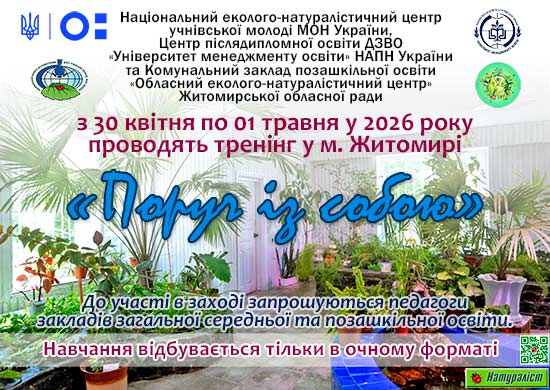 Звершив дводенну роботу тренінг «Поруч із собою», який Національний еколого-натуралістичний центр учнівської молоді МОН України та Центр післядипломної освіти ДЗВО «Університет менеджменту освіти» НАПН України 26-27 лютого провели в очному форматі в м. Києві. Тренінг проводився з метою посилення внутрішніх ресурсів педагогів, підтримки професійної ідентичності, мотивації та емоційної стійкості у період змін. Читати далі »