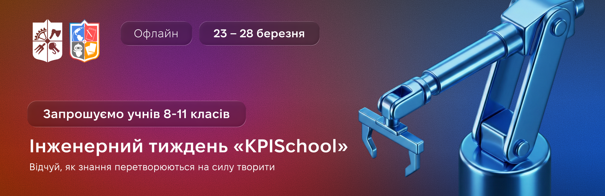 Національний технічний університет України «Київський політехнічний інститут імені Ігоря Сікорського» висловлює Вам глибоку повагу та запрошує долучитися до Інженерних тижнів «KPISchool», який буде проходити в рамках проекту «Майбутній КПІшник» 23 – 28 березня 2026 для учнів 8-11 класів. Формат проведення – очний на території університету (програма заходів – у Додатку). Інженерний тиждень «KPISchool» — це […]