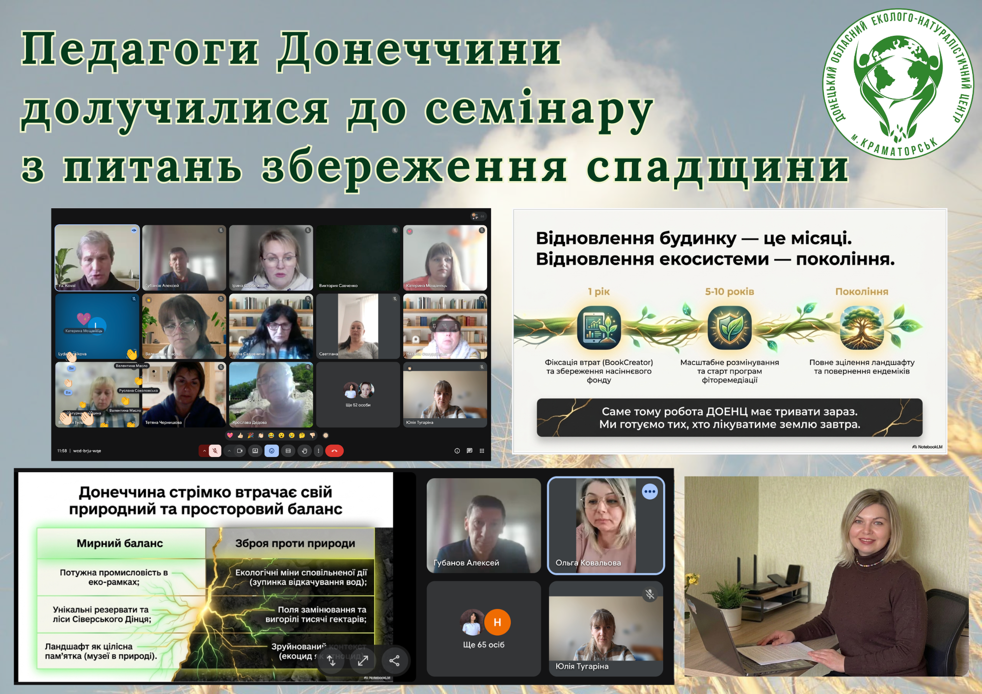 27 квітня педагоги Донецького обласного еколого-натуралістичного центру долучилися до семінару «Історико-археологічна спадщина Сходу України: проблеми збереження та вивчення у воєнний час», присвяченого актуальним питанням збереження культурної та природної спадщини регіону в умовах війни. Організатором заходу став Донецький обласний краєзнавчий музей.