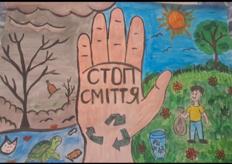 Дитячий-малюнок-фарбами-долоня-з-написом-Стоп-сміття.-Зліва-забруднена-планета-справа-зелена-та-квітуча-768x544.jpg